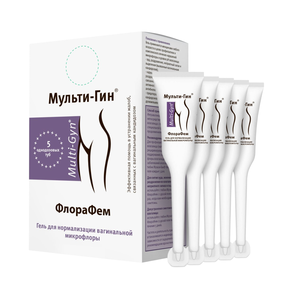 Прямые поставки от официального дистрибьютора с русской инструкцией. ФлораФем Мульти-Гин (FloraFem Multi-Gyn, Нидерланды) представляет собой интимный гель для женской гигиены (5 шт по 5 мл) с характерным запахом алоэ.